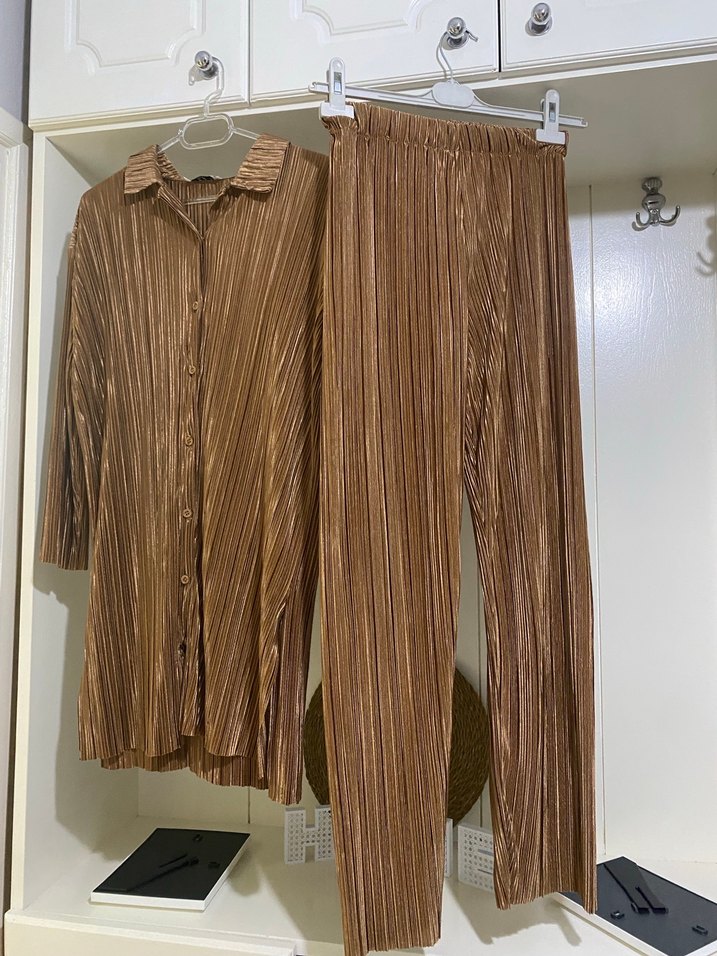Bej renkli, uzun piliseli ve bol kesim kadın takım elbisesi. Keten kumaştan, parlak dokulu ve kesik yakalı, günlük kullanıma uygun rahat normcore tarzda.