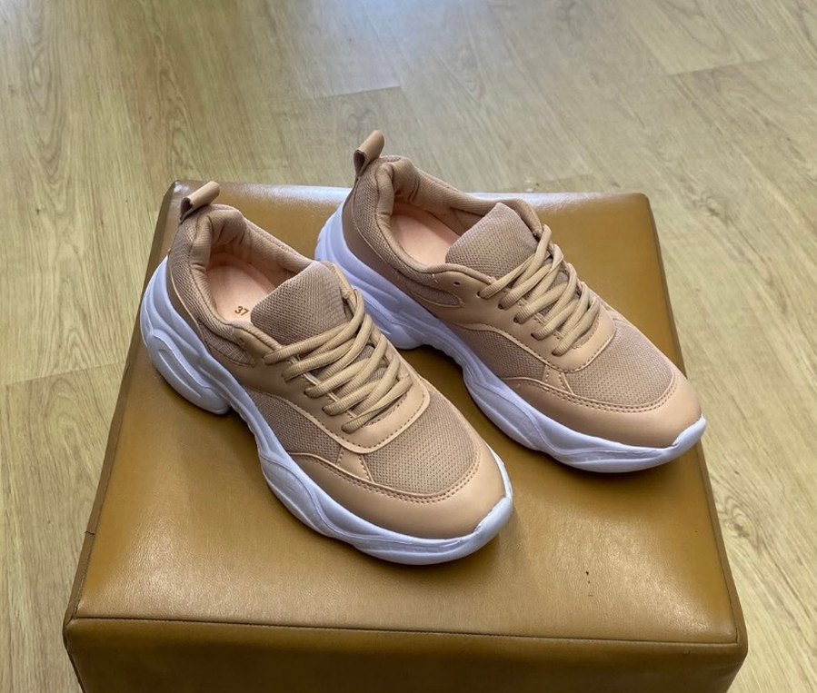 Bej renkte, kauçuk tabanlı kadın platform spor ayakkabısı. Hafif ve desensiz tasarımıyla trend sokak stiline uyum sağlar.