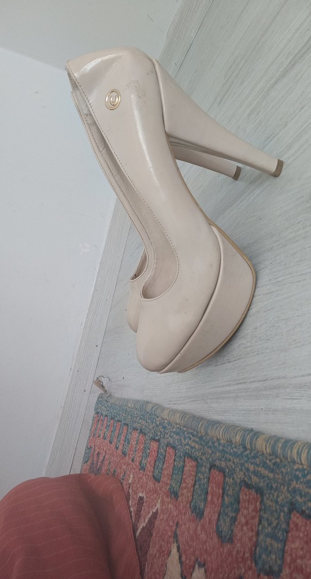 Bej renkte, platform topuklu ve tokalı, kauçuk malzemeden yapılmış kadın stiletto. Minimalist ve çağdaş tasarımıyla ofis için uygun.