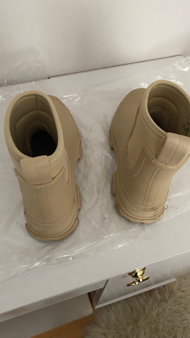 Bej renkte, platform topuklu lastik botlar, günlük kullanım için uygundur. Minimalist ve desensiz tasarımıyla şık ve modaya uygun sokak stili sunar.
