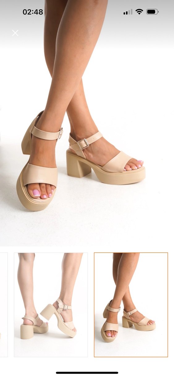 Bej renkli, tokalı kayışa sahip platform topuklu sandaletler. Kauçuk malzemeden yapılmış, minimalist ve çağdaş tasarıma sahiptir. Her gün kullanıma uygundur.