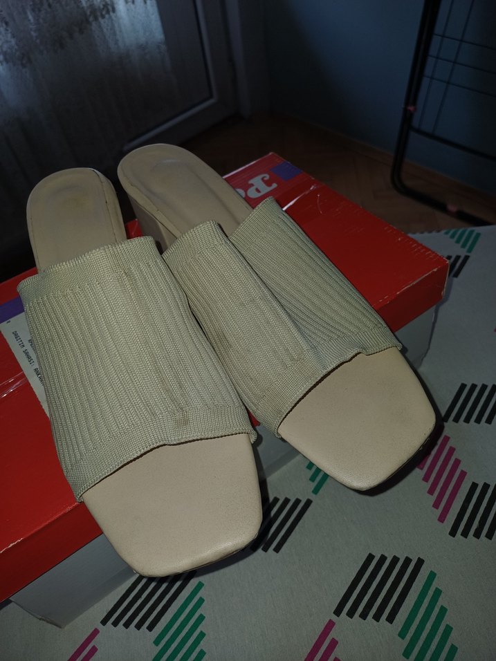 Bej renkte, plise detaylı lastik üst yüzeyli, dolgu topuklu kadın terlik, minimalist ve günlük kullanım için uygundur.