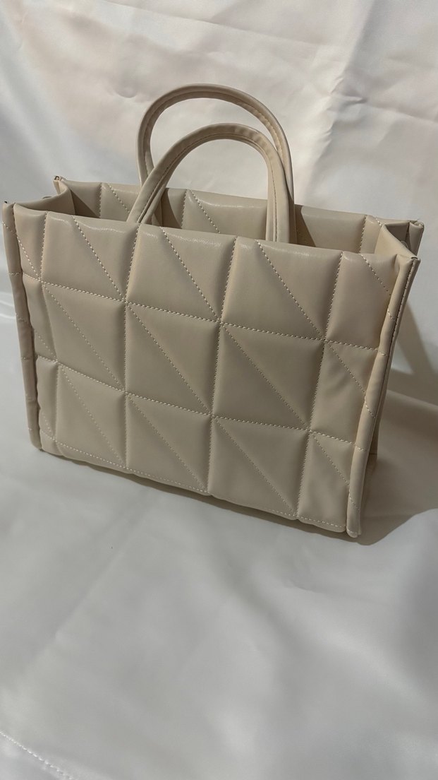 Bej renkli, sentetik kumaştan yapılmış kadın çantası. Pliseli tasarımı ve sade, desensiz görünümüyle günlük kullanıma uygundur. Sağlam sapları ve yapılı formu vardır.