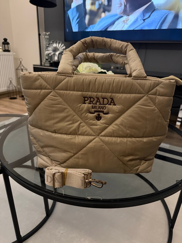 Yumuşak kürk kumaştan yapılmış bej Prada el çantası. Baskılı desene sahip, fermuarlı kapanışlı ve çıkarılabilir askılı. Trend sokak stili için uygun.
