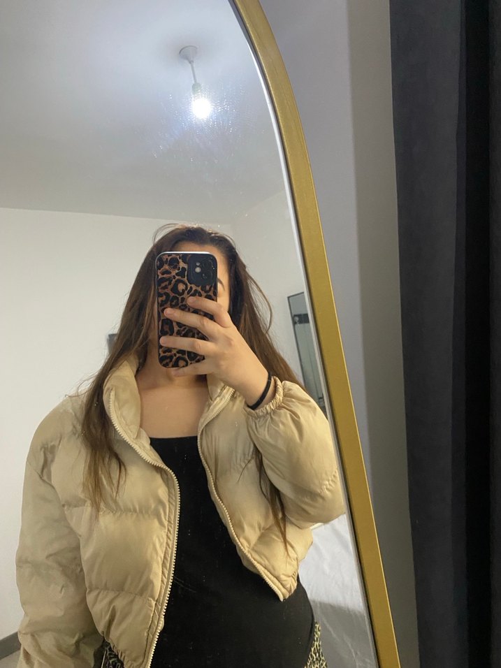 Bej renkli, yüksek yakalı, uzun kollu, fitted kesim kadın kışlık puff mont. Sokak stiline uygun şık tasarım. Ufacık bi lekesi var almak isteyene atarım yıkayınca geçer