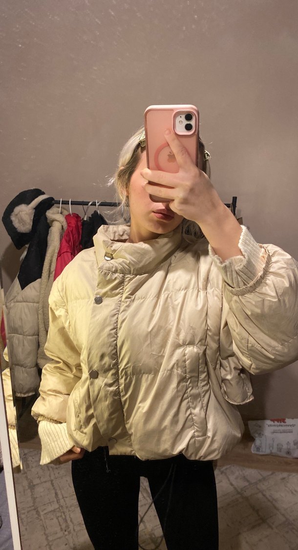 Bej renkli, yüksek yakalı, rahat kesim kadın kışlık mont. Orta boy, puff detaylı tasarım, uzun kollu ve günlük rahat sokak stiline uygun.