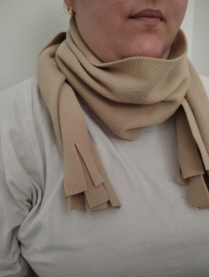Bej renkte, yumuşak ve sıcak kumaştan kadın atkısı. Rahat sokak stili için drapeli tasarıma sahip, sade ve temel bir model.