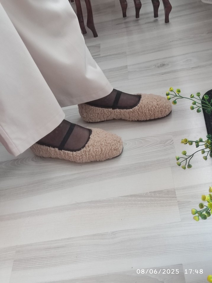 Bej renkli, bağcıklı detaylı, kauçuk malzemeden yapılmış sıcak ev terliği. Pastel tonlarda, desensiz ve rahat bir tasarım.