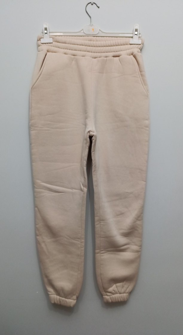 Bej renkli, rahat kesim ve yumuşak, sıcak kumaştan kadın eşofman altı. Orta boy, lastikli bel ve ceplidir. Günlük rahat kullanım için uygundur.