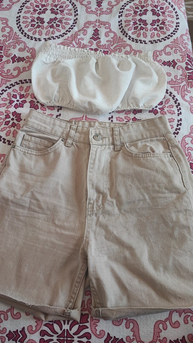 Bej Kadın Rahat Kesim Kısa Kumaş Pantolon + büstiyer
