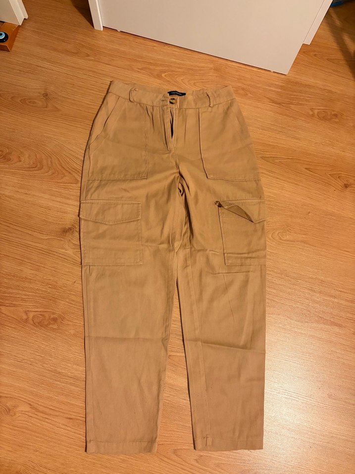 Bej renkli, bol kesim ve midi boyda, sentetik kumaştan üretilmiş kadın pantolonu. Rahat sokak stili için tasarlanmıştır, zahmetsiz şıklık sunar.