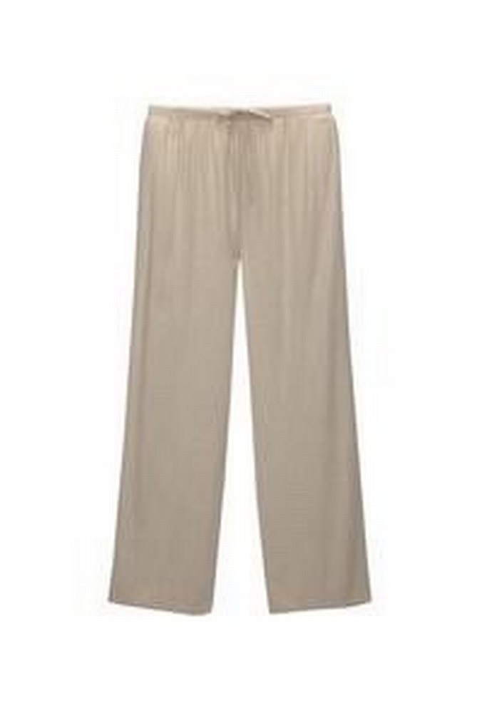 Bej renkli, rahat kesim ve midi boyda kadın pantolonu. keten kumaştan üretilmiş, sade ve desen içermeyen normcore tarzıyla günlük kullanıma uygundur.