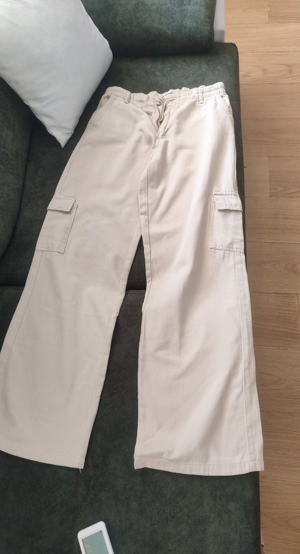 Yumuşak pamuk kumaştan yapılmış bej, rahat kesim midi pantolon. Sokak stiline uygun, yan cepleriyle günlük kullanım için pratik.