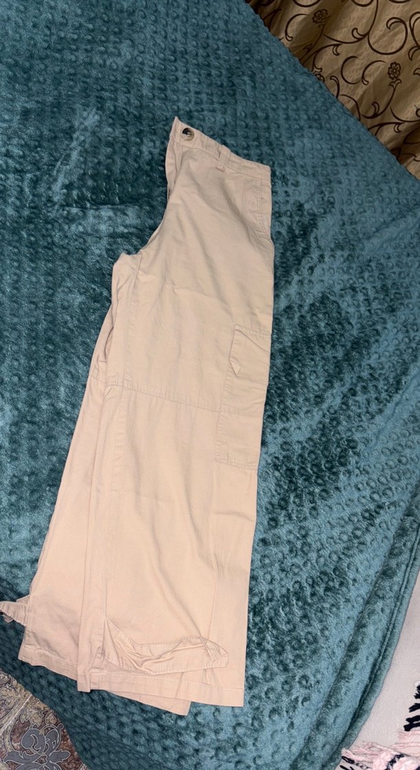 Bej renkte, pamuk kumaştan, rahat kesim ve midi boyda, fermuarlı detaylara sahip rahat ve şık kadın pantolonu.