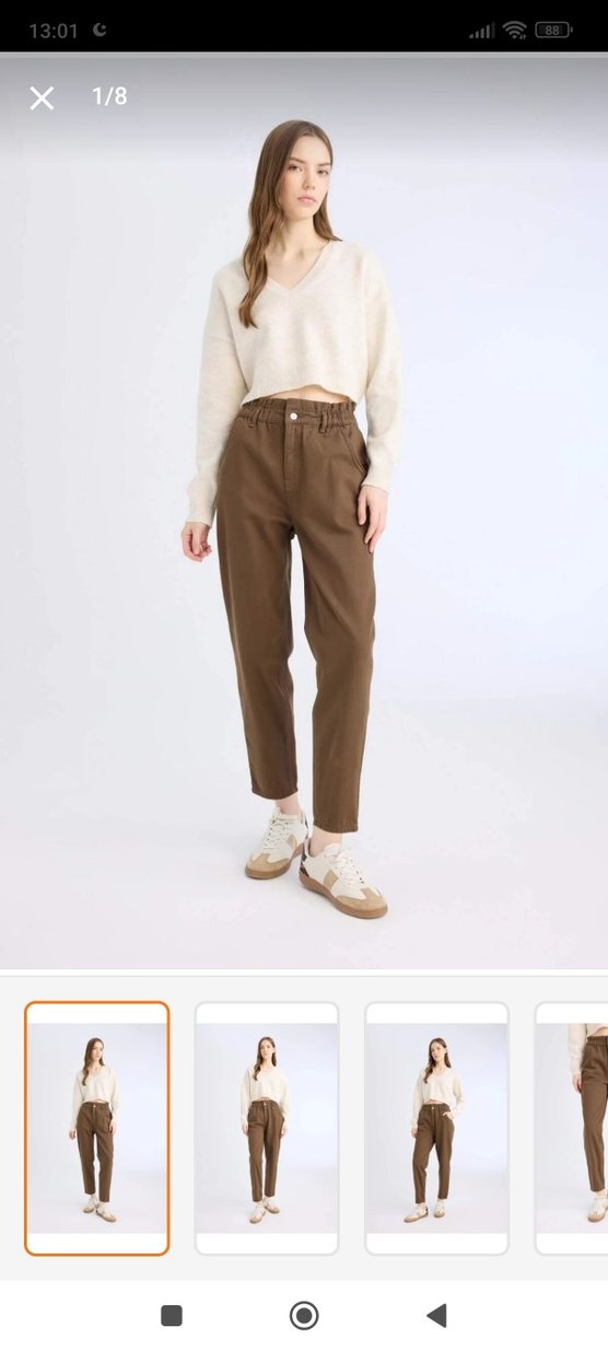 Bej renkli, pamuklu kumaştan rahat kesim kadın pantolon. Midi boy ve desen içermeyen tasarımı günlük kullanıma uygundur.
