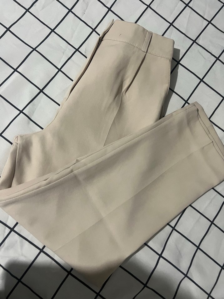 Bej renkte, regular fit kesim, düz ve midi boyda, yumuşak sentetik kumaştan kadın pantolonu. Minimalist ve günlük kullanıma uygun.