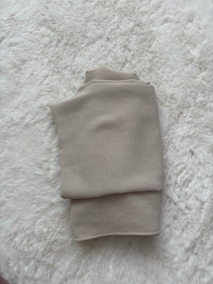 Bej renkte, yumuşak keten kumaştan yapılmış, kürk detaylı kadın şalı. Rahat ve bohem tarzda, sade ve temel gardıroplar için uygundur. az kullanıldı