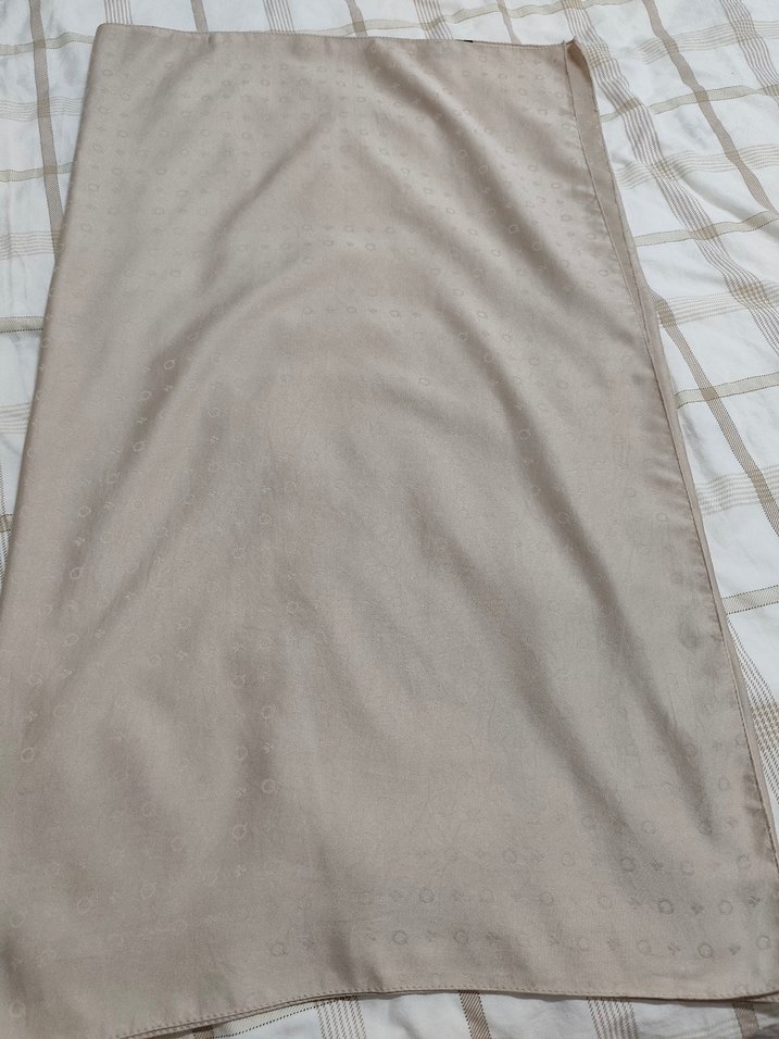 Bej renkte, drapeli tasarıma sahip, yumuşak sentetik kumaştan kadın şalı, minimalist ve klasik tarzda.