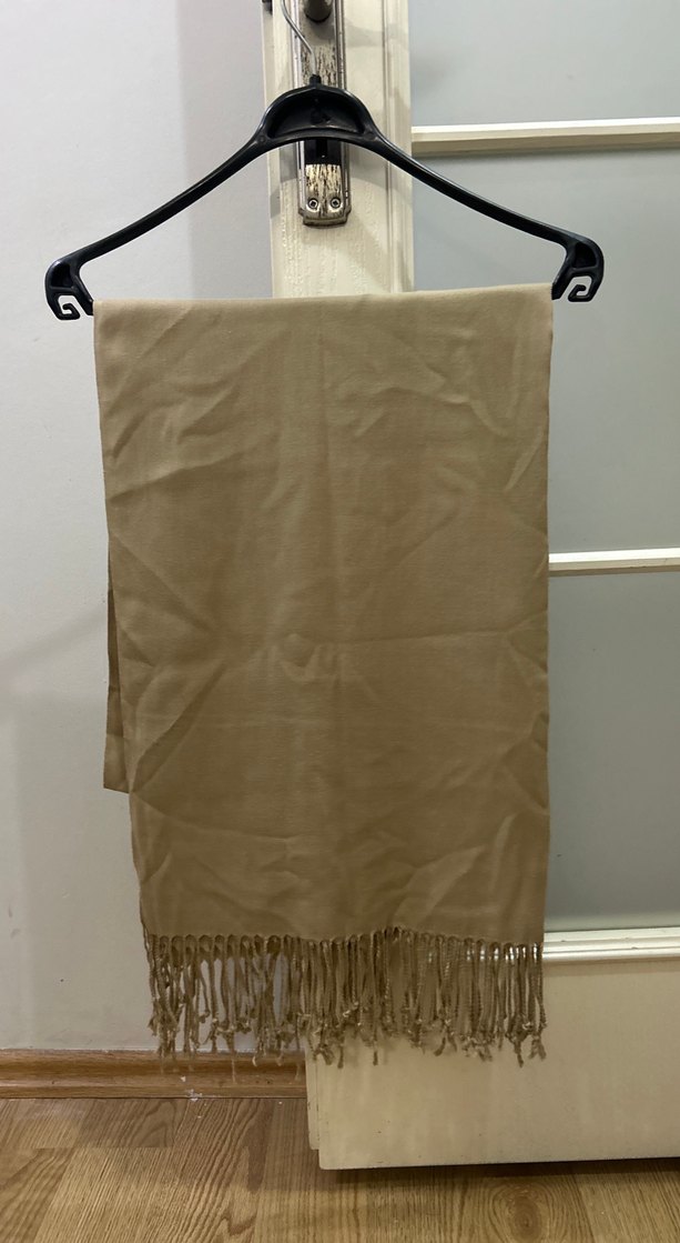 Bej kadın şal, yumuşak sentetik kumaştan yapılmış, salaş tasarımlı ve püsküllü kenarlarıyla rahat bir bohem stil sunar.