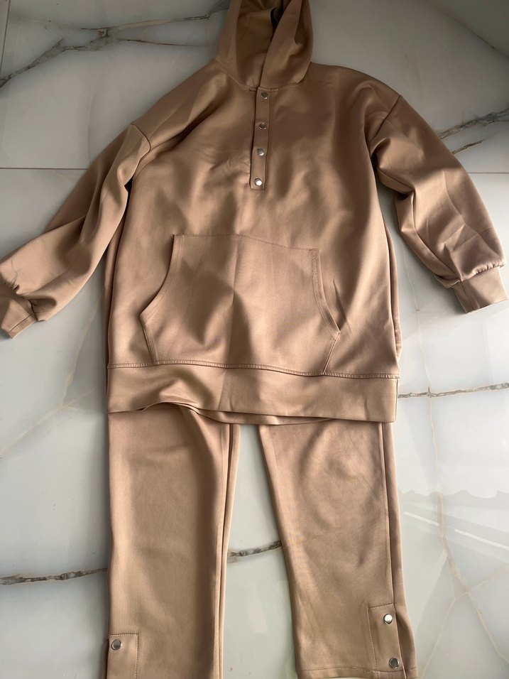 Bej renkli, uzun kollu ve yakası düğmeli, salaş kesim kadın eşofman takımı. Yumuşak sentetik kumaştan, günlük kullanıma uygun rahat bir model. ♀️