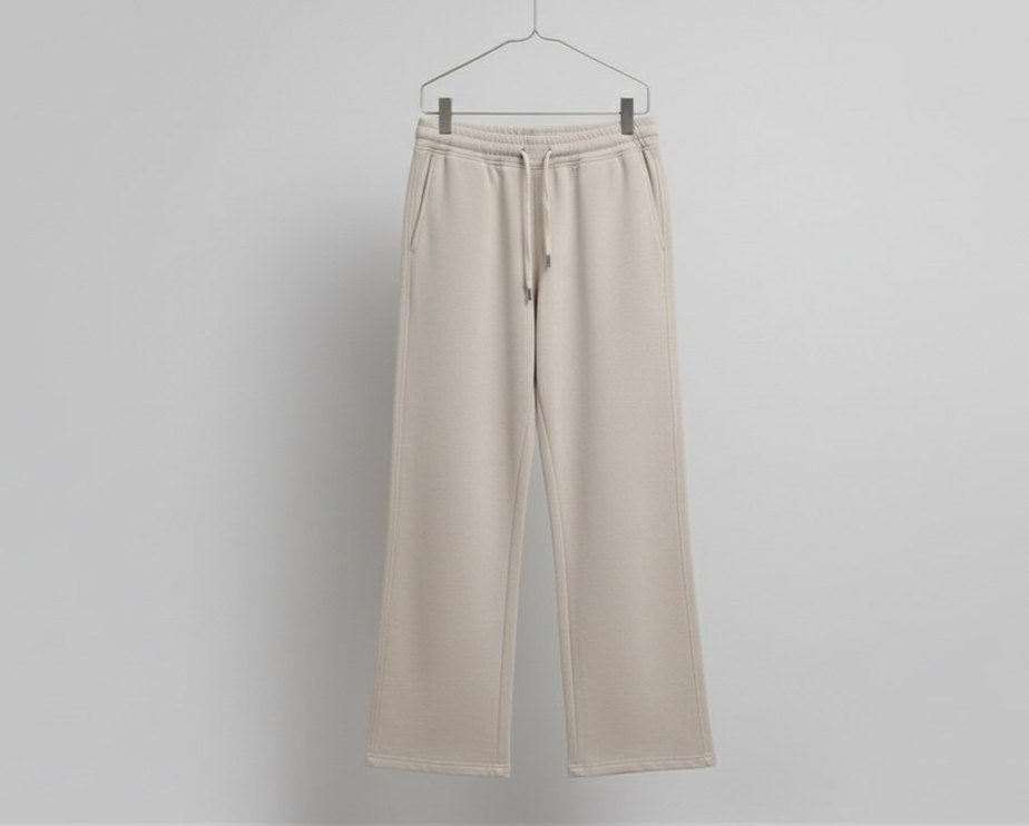 Yumuşak sentetik kumaştan, elastik bel ve bağcıklı bej renkli, salaş kesim kadın eşofman altı. Günlük rahat şıklık için uygun.