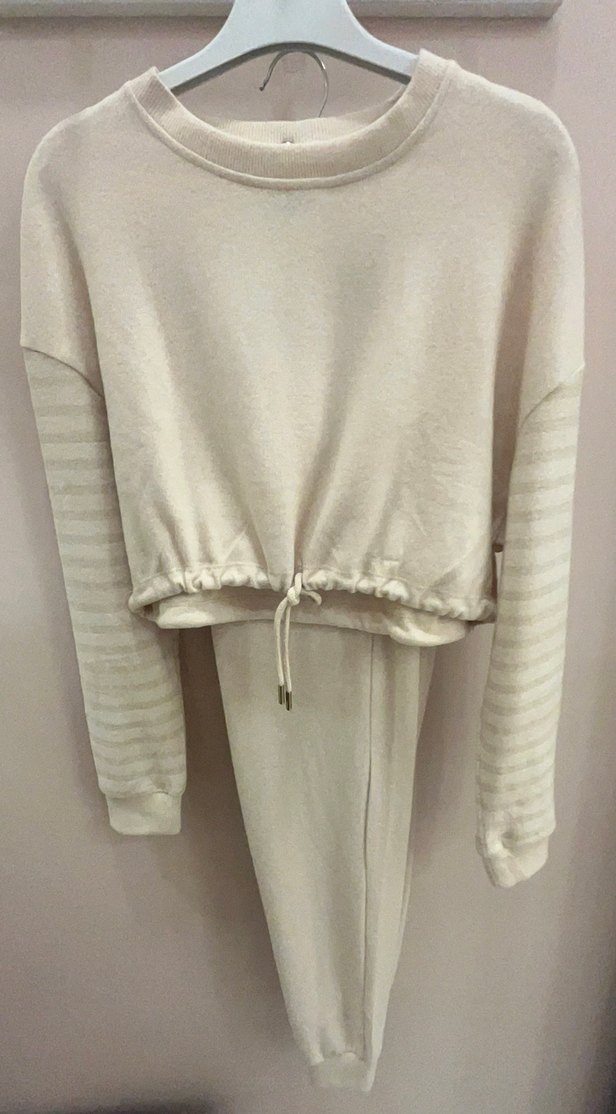 Açık bej renkli, uzun kollu ve salaş kesime sahip kadın eşofman takımı. Yumuşak kumaştan, uzun boylu ve ayarlanabilir bağcık detayıyla rahat ve şık bir görünüm sunar. Günlük kullanım için uygundur. Özel tasarım üründür, İstanbul’da üretilmiştir. ♀️