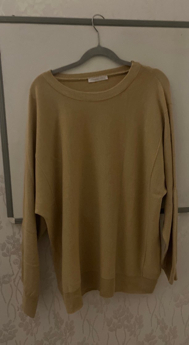 Bej renk, keten kumaştan yapılmış, yuvarlak yaka ve uzun kollu, salaş kesim kadın kazak. Günlük kullanım için uygundur.