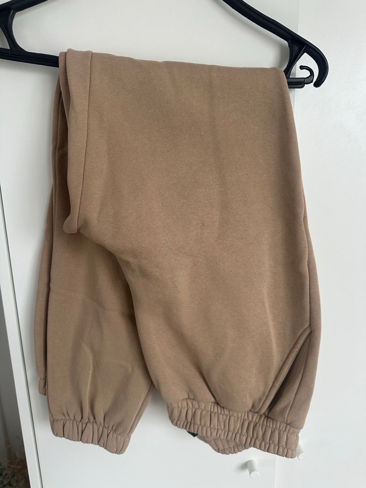 Bej renkli, salaş kesim ve midi boyda, yumuşak ve sıcak kumaştan kadın eşofman altı. Rahatlık için lastikli paçalar ve sokak stili tasarım sunar. Günlük kullanım için uygundur.