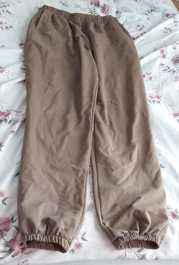 Bej renkte, salaş kesim ve drapeli tasarımlı, lastikli bel ve paçalarla günlük kullanıma uygun keten kumaştan erkek sweatpant.
