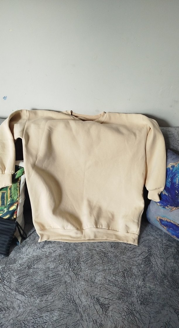 Bej renk, salaş kesim, yuvarlak yaka ve uzun kollu kadın sweatshirtü. Yumuşak ve sıcak kumaştan, günlük rahat sokak stili için uygun.
