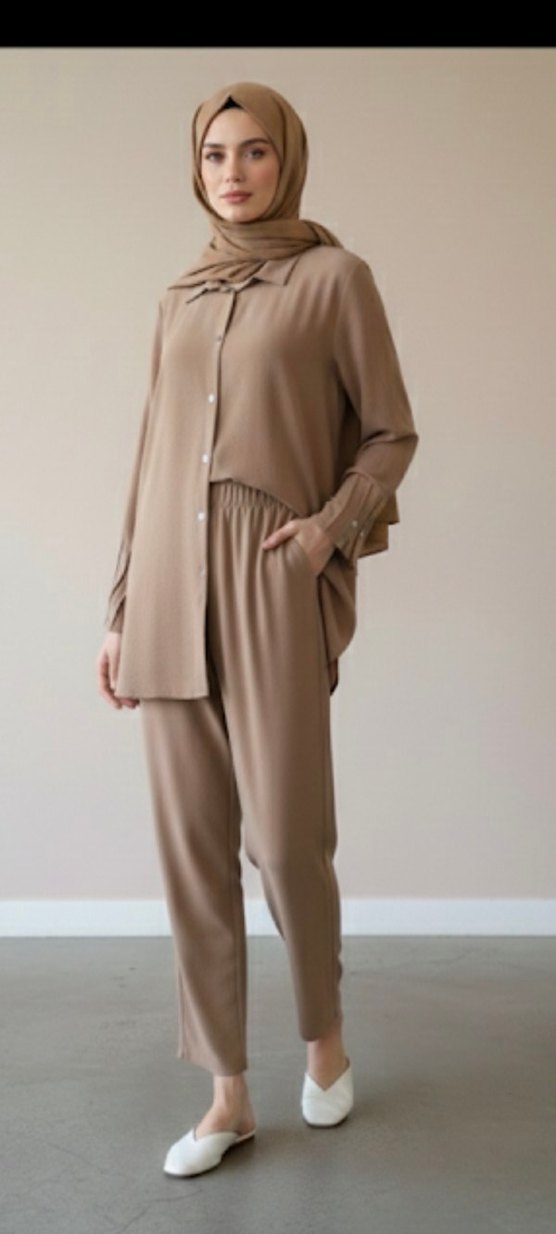 Uzun kollu, kesik yakalı, salaş kesim bej kadın takım elbise. İpeksi kumaştan, rahat ve şık tasarım. Günlük kullanıma uygun. ✨
