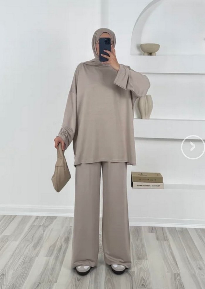 Bej renkli, uzun kollu ve yuvarlak yaka, yumuşak kumaştan yapılmış kadın salaş takım. Günlük kullanım için rahat ve sade şıklık sunar. Ürün kullanılmamış sadece yıkanmıştır