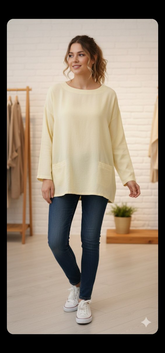 Bej renkte, uzun kollu ve yuvarlak yakalı salaş tunik. Midi boyda, düz ve rahat kesimiyle günlük kullanıma uygun şık bir parça.