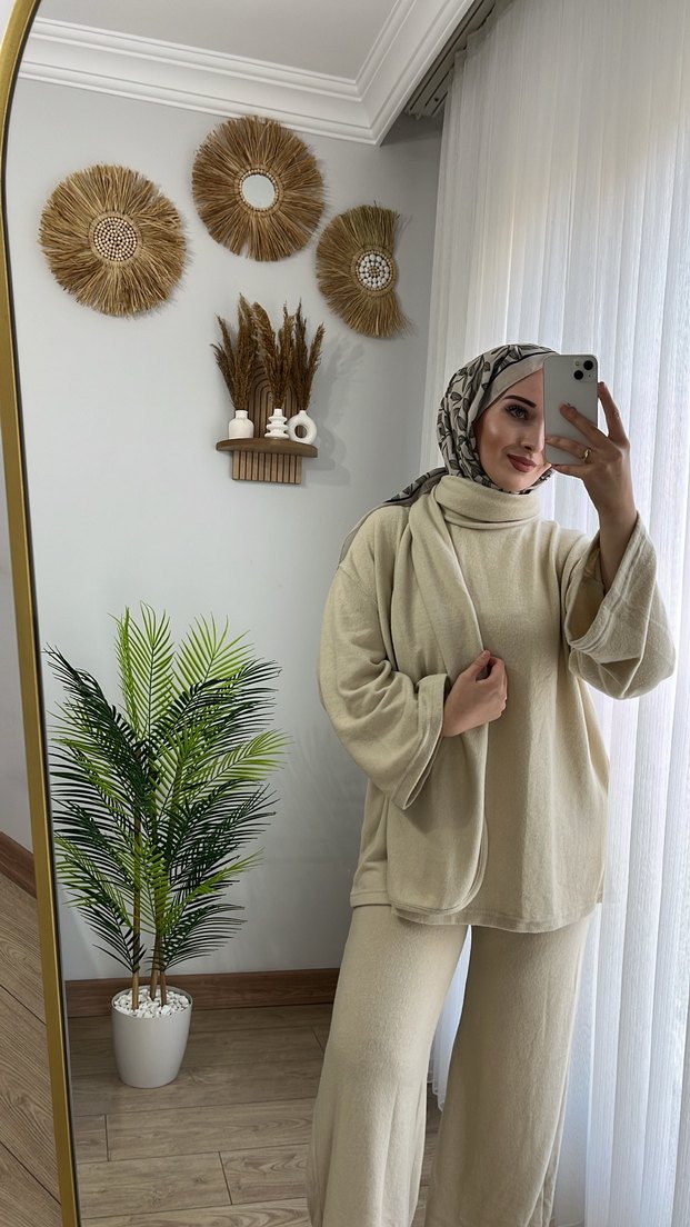 Bej Kadın Şallı Rahat ve Şık Takım