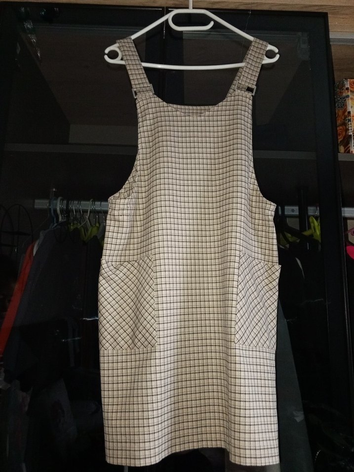 Bej zemin üzerine gri kareli deseni ve kullanışlı iki ön cepleri bulunan kadın Salopet 40 beden defacto marka hiç giyilmedi