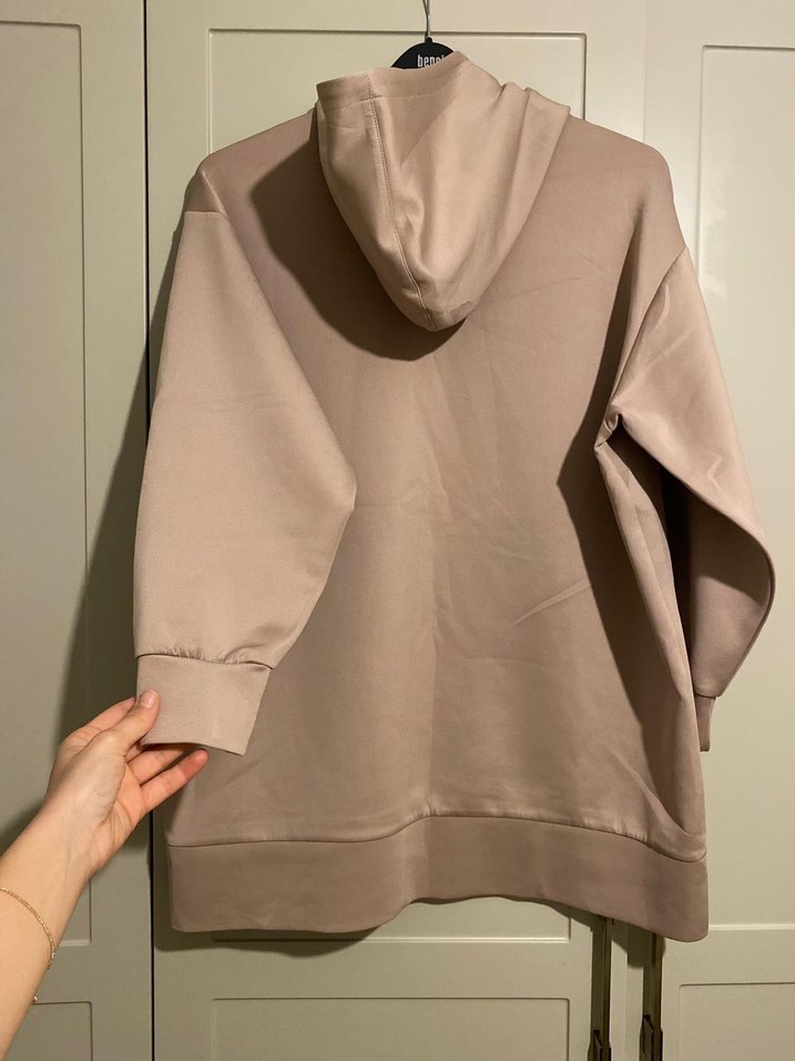 Bej renkte, uzun kollu, kapüşonlu kadın sweatshirtü. Rahat ve bol kesimli, yumuşak sentetik kumaştan üretilmiştir. Günlük kullanım ve sportif şıklık için uygundur.