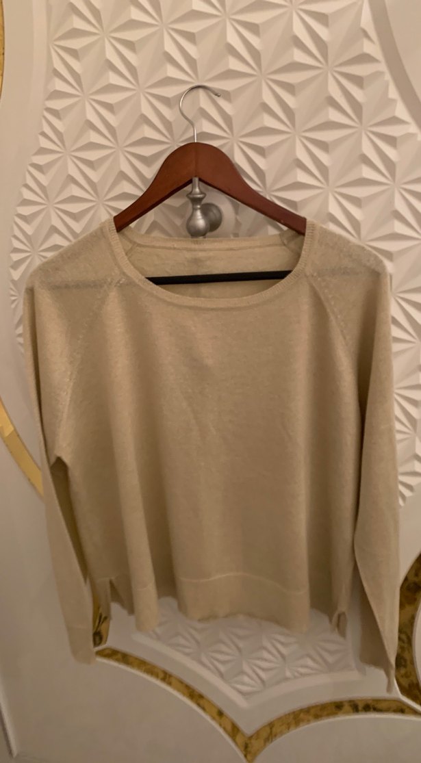 Bej rengi Yuvarlak yaka ve uzun kollu,simli kumaş rahat ve bol kesim, günlük kullanıma uygun