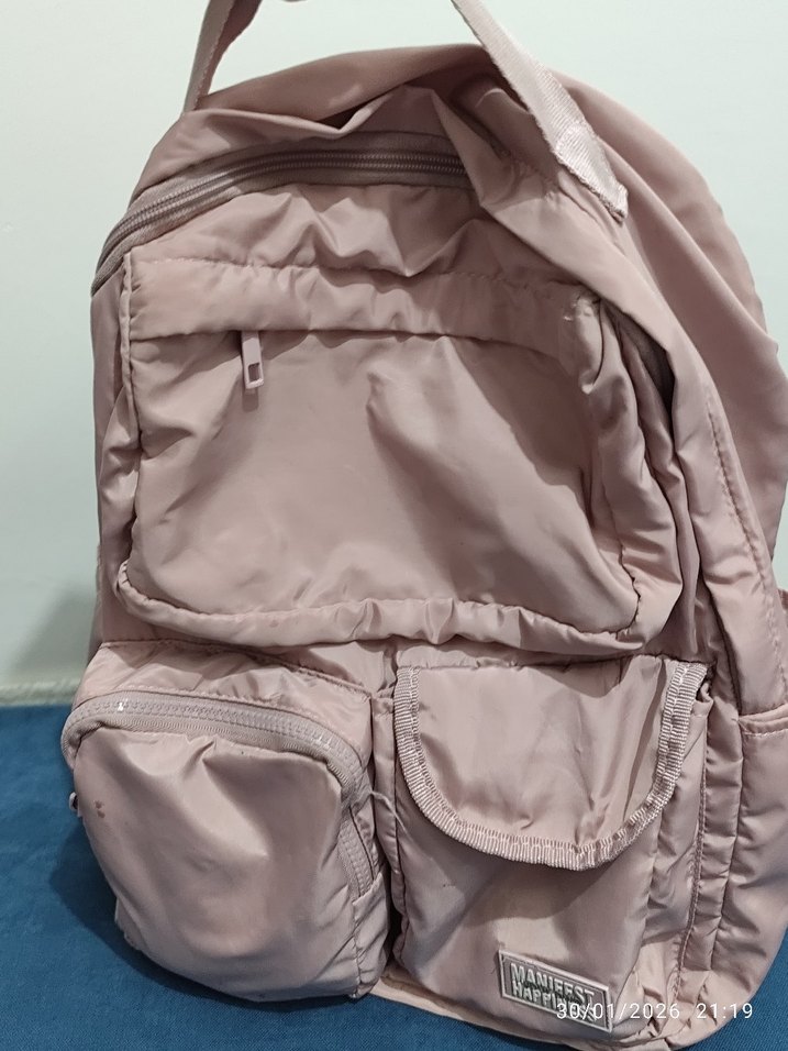Pastel bej renkte, fermuarlı çoklu cepleri olan, sentetik kumaştan yapılmış kadın sırt çantasıdır. Sokak stili ve günlük kullanım için uygundur.