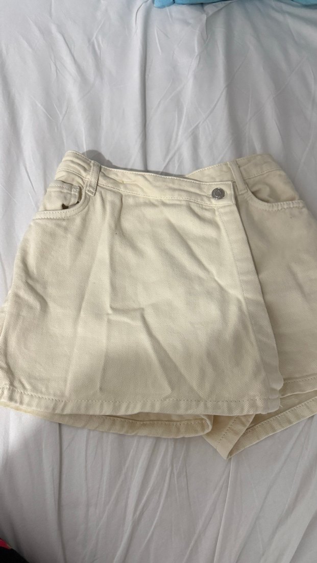 Bej renkli mini keten şort etek, rahat kesimi ve sade tasarımıyla günlük sokak stiline uygundur. belinde pens var