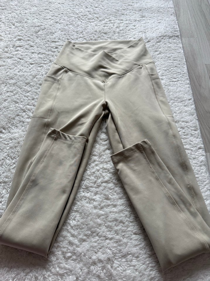 Bej renkli, midi boy ve yumuşak sentetik kumaştan yapılmış, günlük rahat sokak stili için şık kadın spor taytı. ♀️ ✨ yenidir hiçbir sorunu yoktu Trendyol’dan alındı bir kez kullanıldı