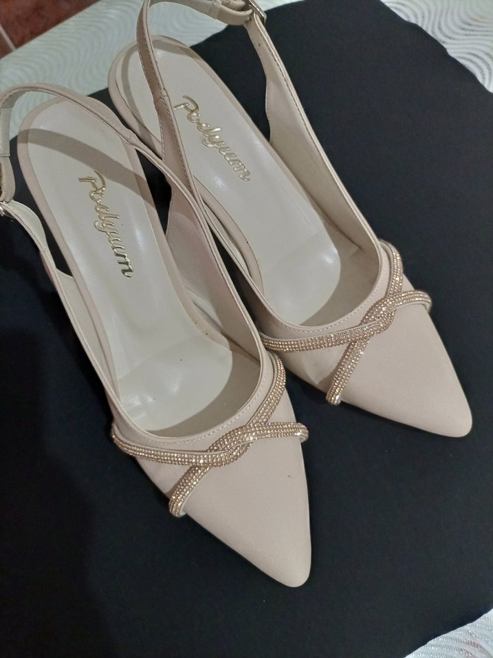 Bej renkte, taşlı detaylara ve hafif yılan derisi desenine sahip modern klasik stilettolar, düğünler için uygun.