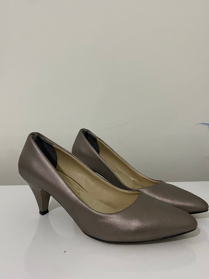 Bej renkte deri stiletto topuklu ayakkabılar, modern klasik tasarıma sahip. Ofis için uygun, zahmetsiz şıklık sunar. 4-5 cm topuk