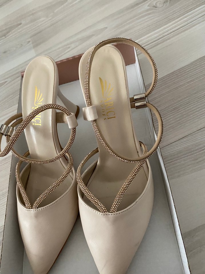 Bej renkli, ipeksi dokulu kadın stiletto topuklu ayakkabı. Hafif yılan derisi deseni ve tokalı kayışıyla düğün ve özel günler için uygun. 3 kez giyildi kusuru yoktur