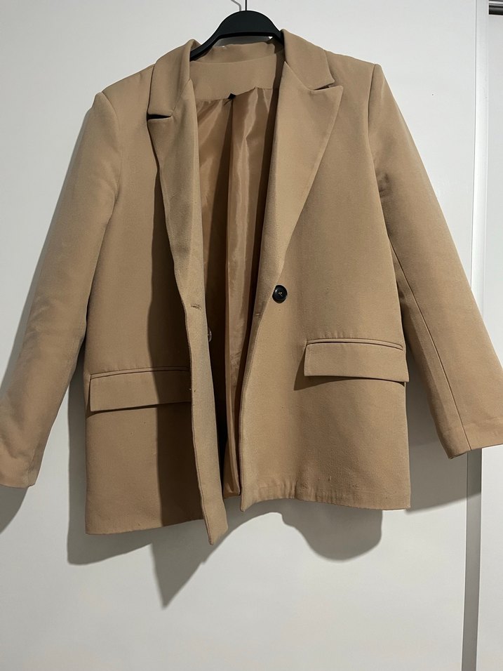 Bej renkli kadın süet blazer ceket, kesik yaka ve düğmeli kapama detaylarına sahiptir. Normal kesim ve uzun kolludur, ofis ve günlük kullanıma uygundur.