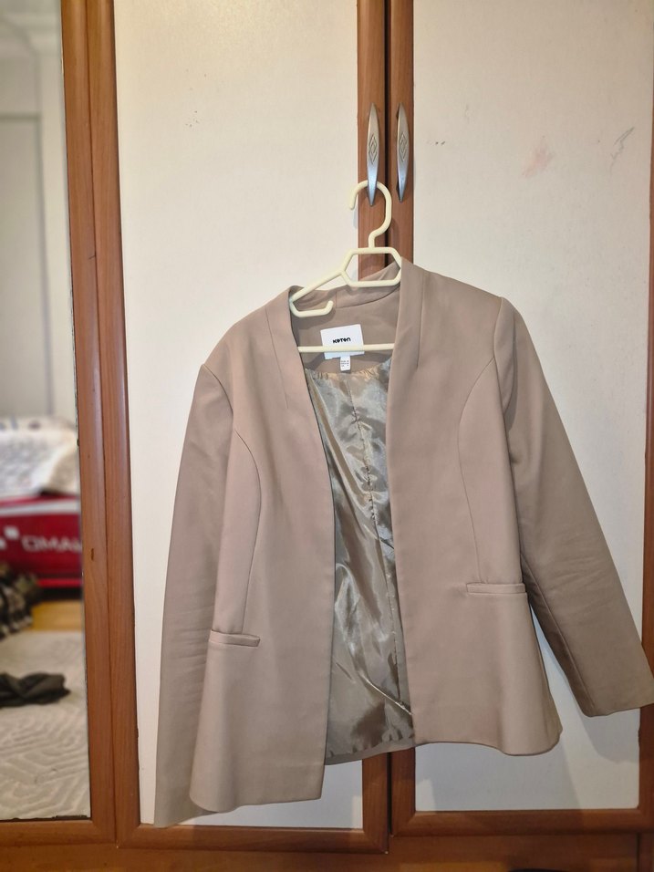 Bej renkte, süet kumaştan yapılmış, normal uzunlukta ve kesim olarak rahat oturan, yakası kesik ve uzun kollu kadın blazer ceket. İş ortamına uygun, desen içermeyen şık tasarım.