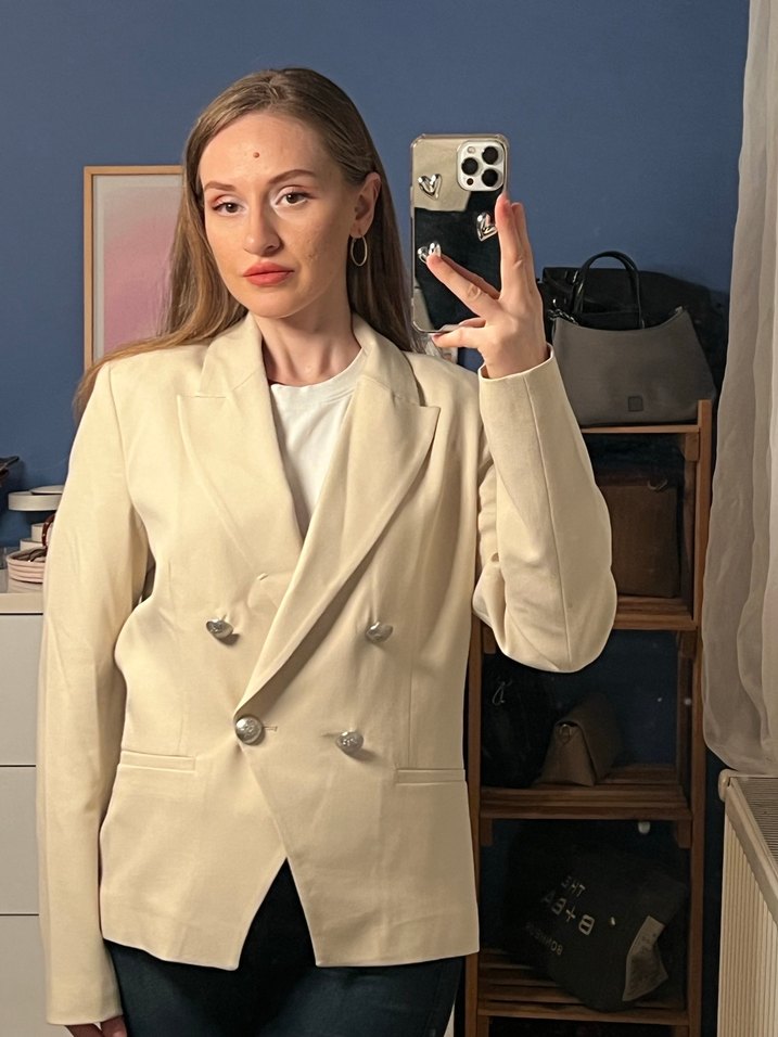 Bej renkte, süet kumaştan düğmeli ve notalı yakalı kadın blazer ceket. Uzun kollu, normal kesim ve midi boyda, ofis için uygun.