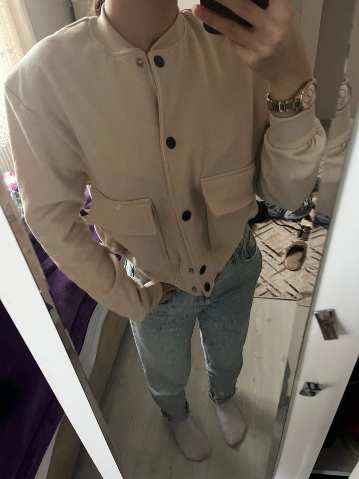 Bej renkte, süet kumaştan yapılmış, düğmeli ve uzun kollu, rahat kesim bir kadın ceketi. Günlük sokak stiline uygun.
