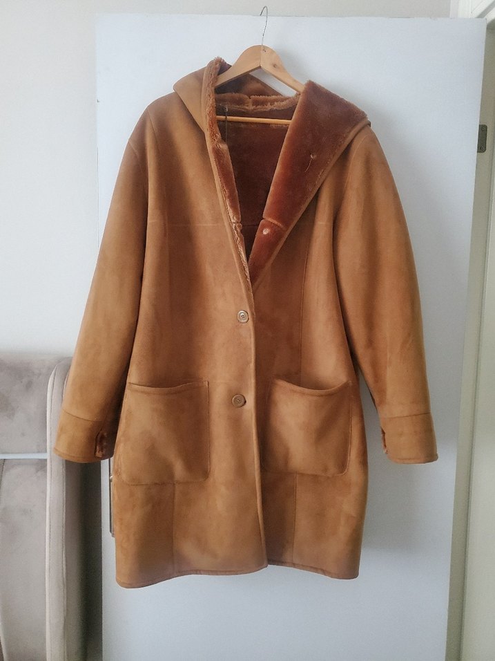 Bej süet kumaştan, düğmeli ve kesik yakalı kadın kabanı. Uzun kollu, normal kesim ve parlak dokulu, iki ön cepli, midi boyda rahat bir modeldir.