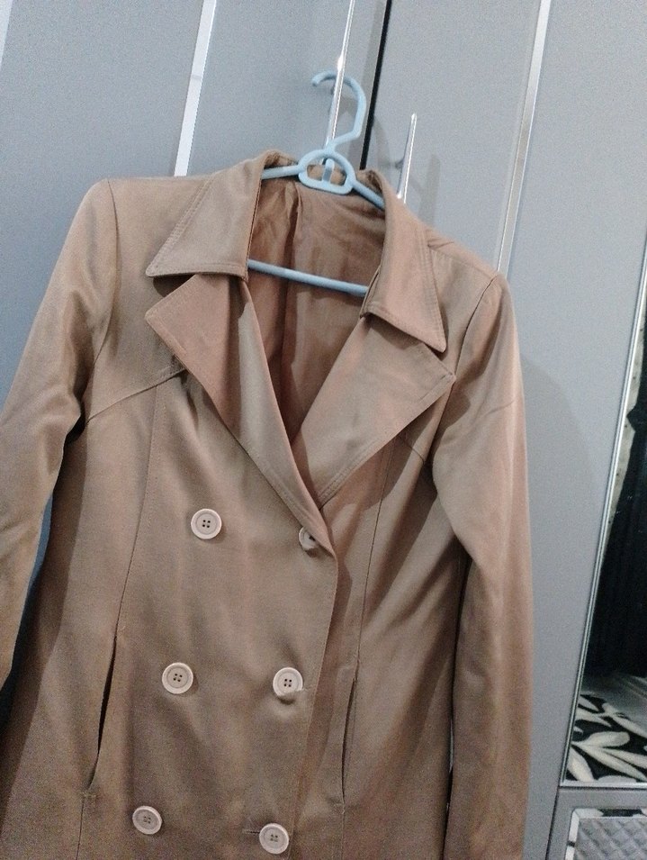 Bej süet düğmeli, normal boy midi trençkot. Çentikli yaka ve askılı kollara sahip, rahat kesim ve desen içermeyen sokak stiline uygun bir parça. m beden dizlere geliyor hafif saten karisimi tertemiz lekesi vs yok