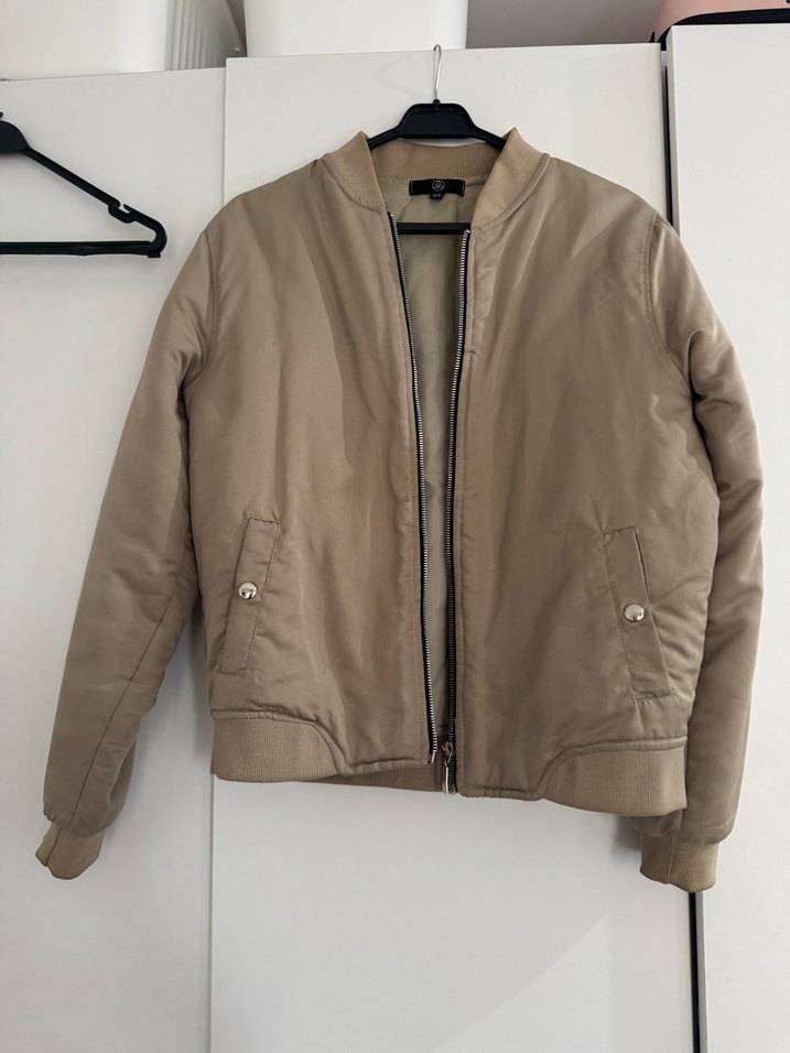 Bej renkte, fermuarlı, uzun kollu, bol kesim kadın süet ceket. Minimalist tarzda, günlük kullanıma uygundur.